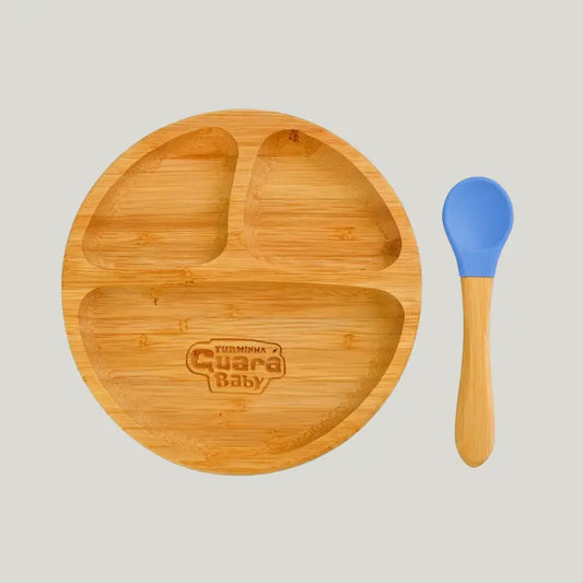 Pratinho Bebê Bambu Com Ventosa E Divisória + Colher De Silicone Introdução Alimentar Azul