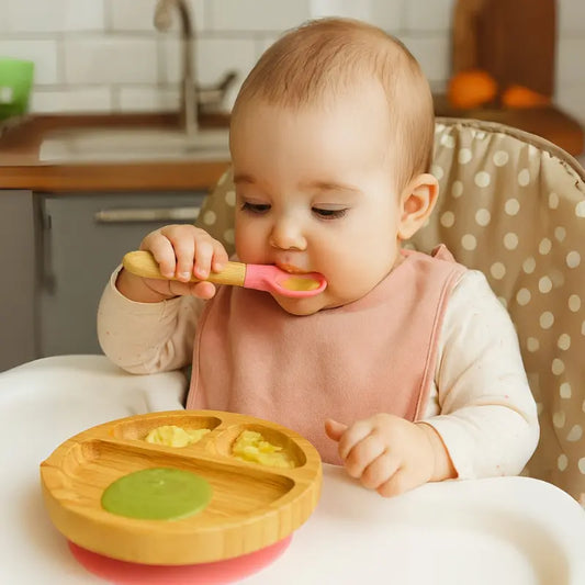 Pratinho Bebê Bambu Com Ventosa E Divisória + Colher De Silicone Introdução Alimentar Rosa