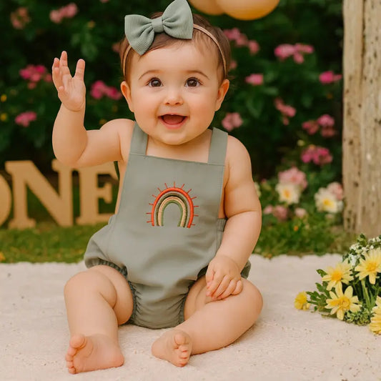 Jardineira Bebê Cogumelo Listrada Verde Acizentado