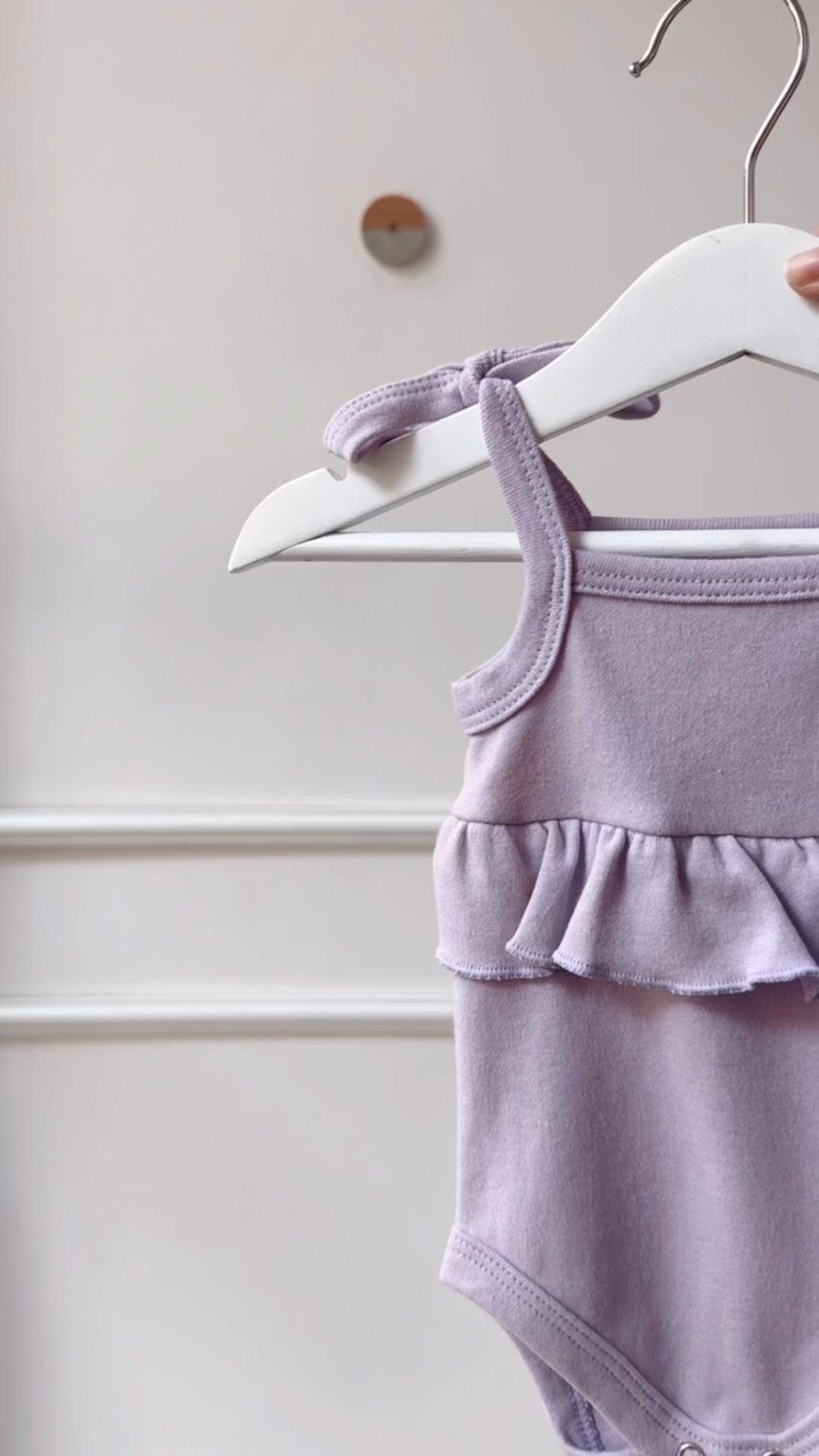 baby girl bodysuit, lilac bodysuit with ruffle, delicate look for baby, comfortable clothes for baby girl, baby clothes from 3 to 12 months
