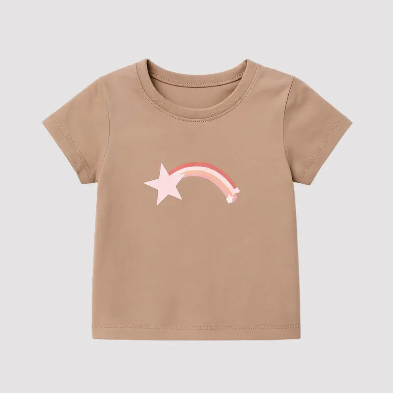 The Rainbow Star Beige Baby T-Shirt is made of soft, breathable cotton , ideal for everyday wear or special occasions. Its rainbow and star print creates a playful and charming look, while the neutral beige tone matches a variety of outfits, pants, and accessories.
