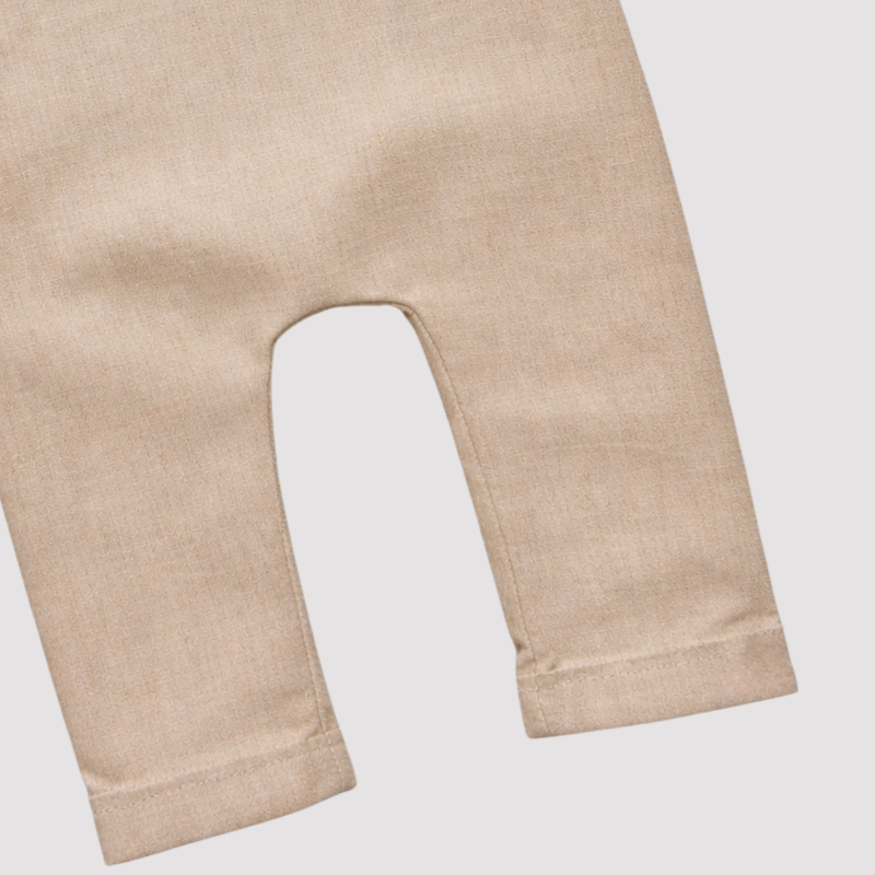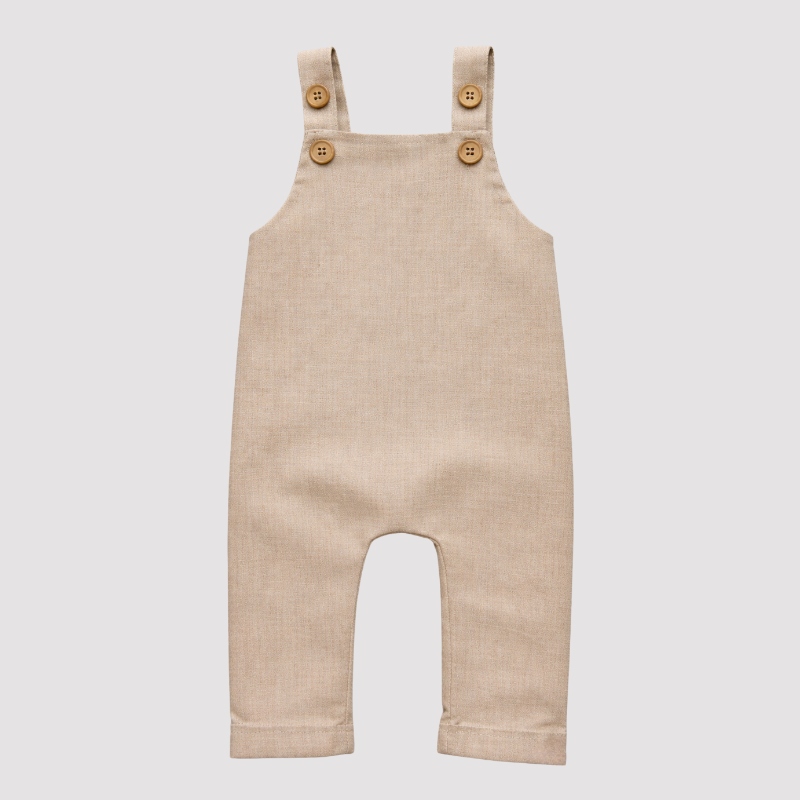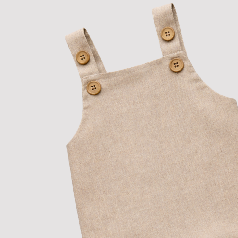As alças com botões trazem praticidade no ajuste, acompanhando o crescimento do bebê, enquanto o tom cru cria um visual clean, elegante e atemporal.