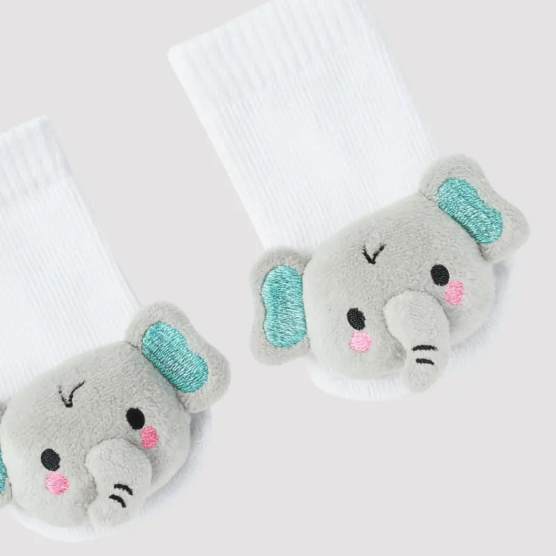 meia bebê sensorial, meia elefante bebê, meia plush bebê, meia com bichinho bebê, acessório bebê fofo, meia divertida bebê, meia estímulo bebê