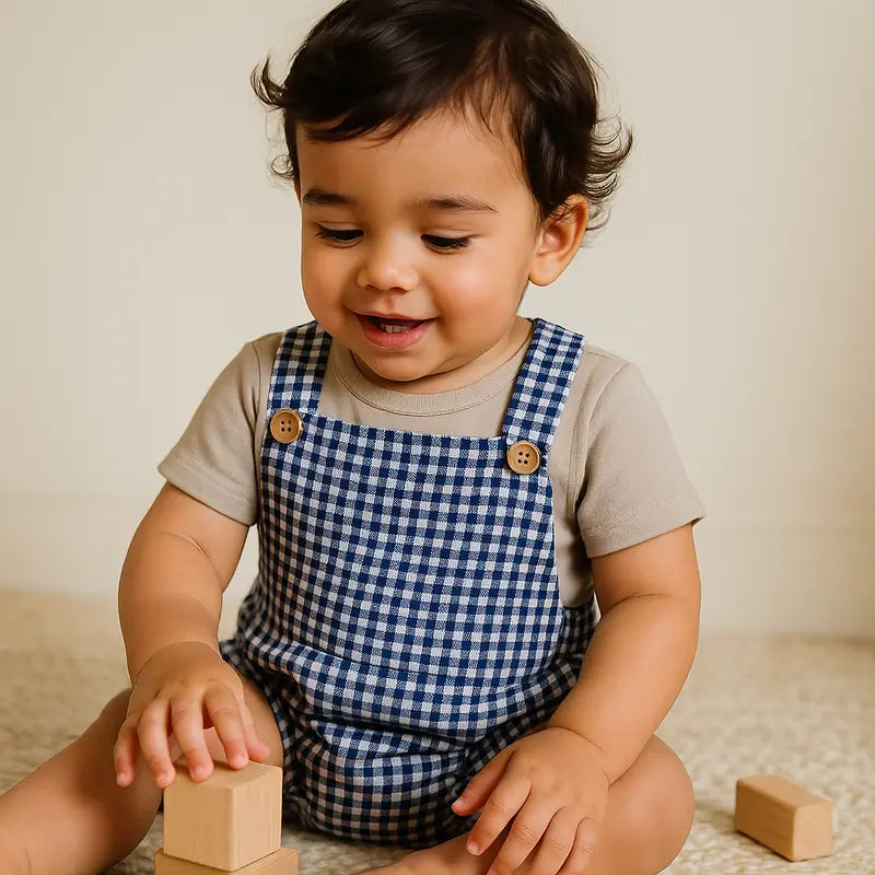 The Navy Blue Baby Chess Romper is an elegant and practical piece that combines style and comfort. With a navy blue plaid print and a classic romper style, this piece is perfect for special occasions, photo shoots, parties, or for a more elegant everyday look.