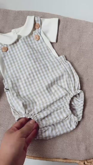 baby plaid romper, neutral clothes for baby girl or boy, beige romper for children's photoshoot, classic baby short jumpsuit look, unisex romper for babies