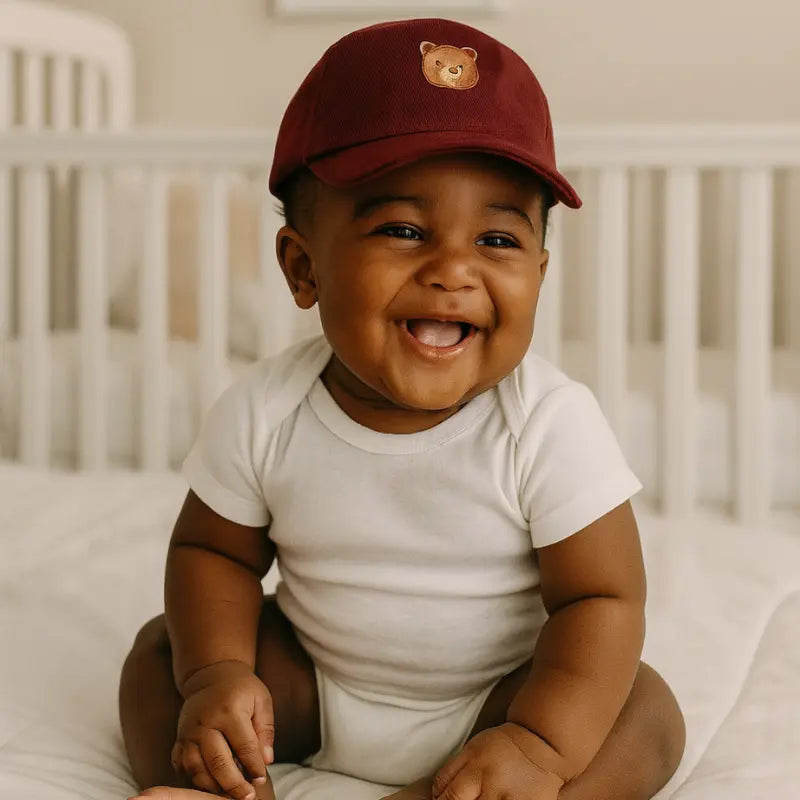gorro de bebé, gorro burdeos, gorro de osito, gorro de osito, gorro unisex infantil, gorro de canastilla, accesorio elegante para bebé, gorro moderno.