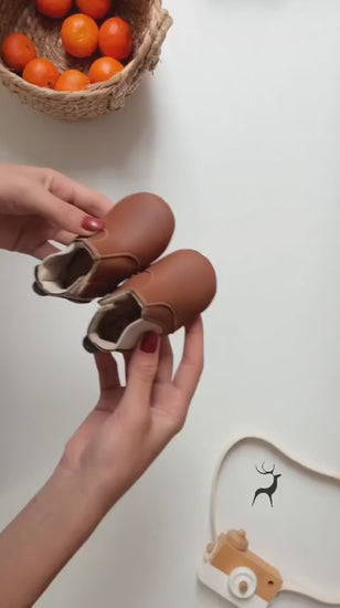 La bota unisex vintage color caramelo para bebé es perfecta para completar looks de otoño e invierno con elegancia y calidez. Con un diseño retro, un acabado impecable y una suela flexible, ofrece estabilidad y libertad para los pies en desarrollo.