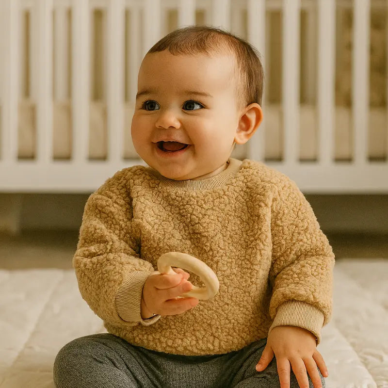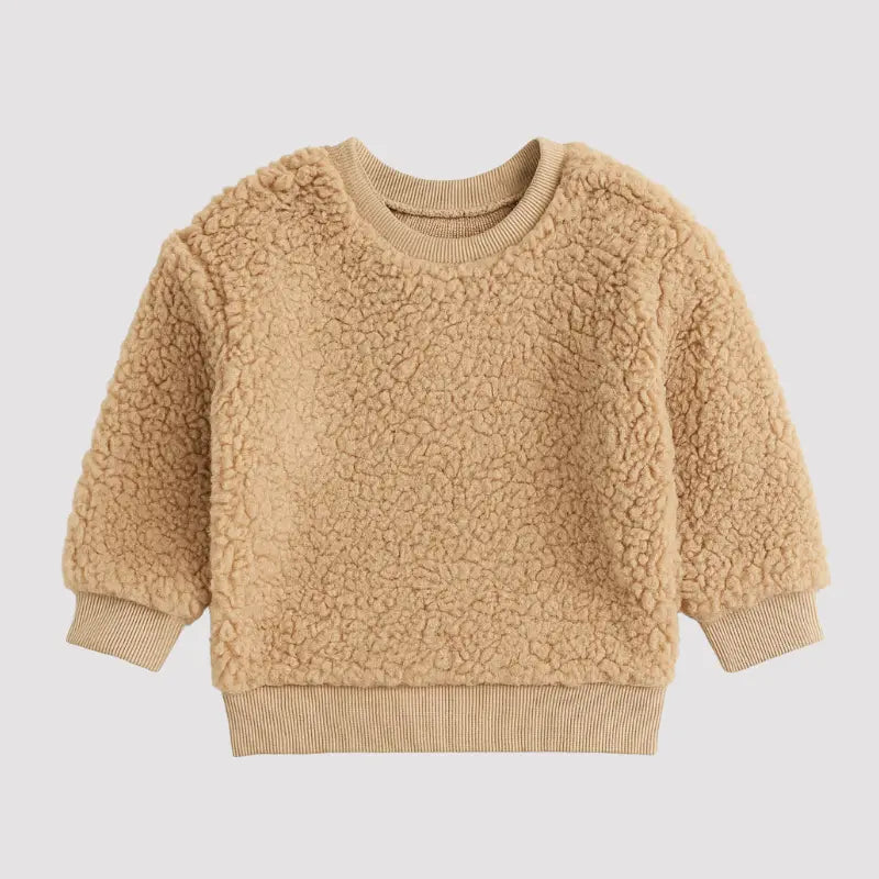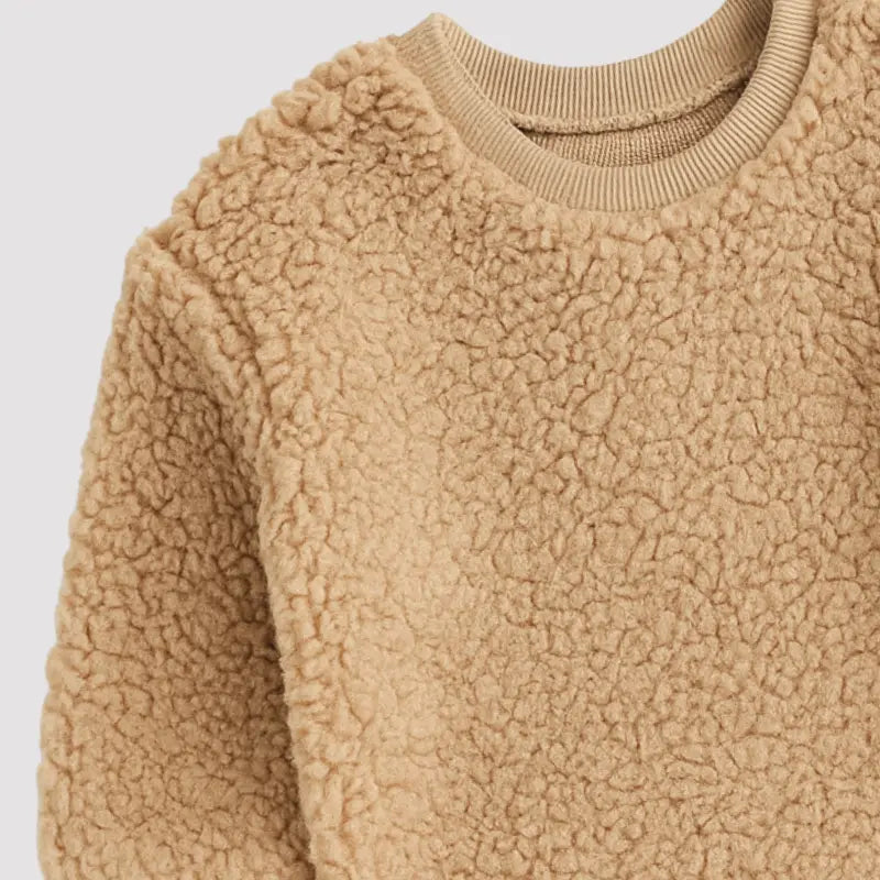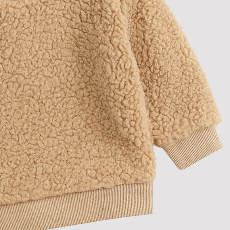 El abrigo caqui de peluche para bebé es perfecto para abrigar a tu bebé con estilo y mucho cariño. Hecho de suave felpa con tacto de osito, este abrigo le da un toque encantador y acogedor a los días de invierno.