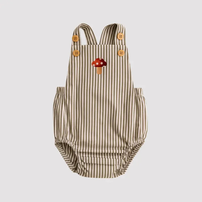 El mono de bebé con diseño de hongo a rayas verde grisáceo está confeccionado en algodón suave, ligero y transpirable, lo que garantiza el bienestar y la libertad de movimiento para tu bebé.