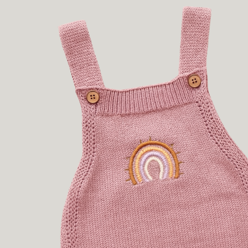 Los monos de punto para bebé Rainbow Rose están confeccionados con un tejido de punto suave y liviano , lo que garantiza comodidad, libertad de movimiento y un toque acogedor.