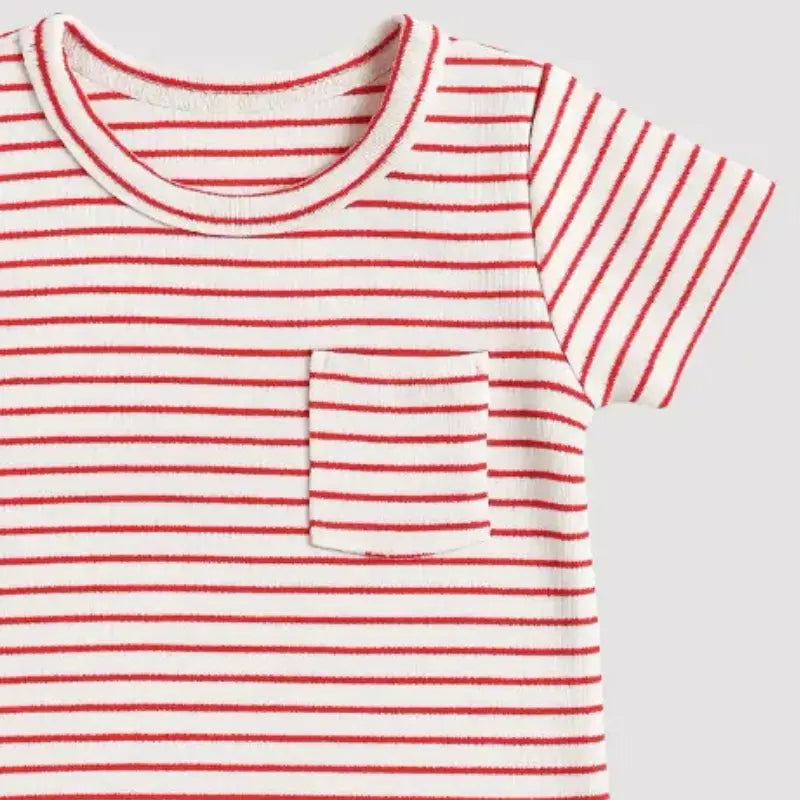 Com estampa listrada em tom vermelho (Red), é moderna, versátil e unissex, ideal para compor combinações com calças, shorts e jardineiras.