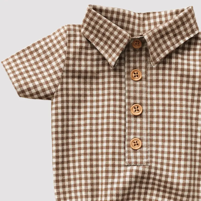 O Body Bebê Social Xadrez Brown é confeccionado em algodão macio e respirável, proporcionando bem-estar e praticidade para o bebê.