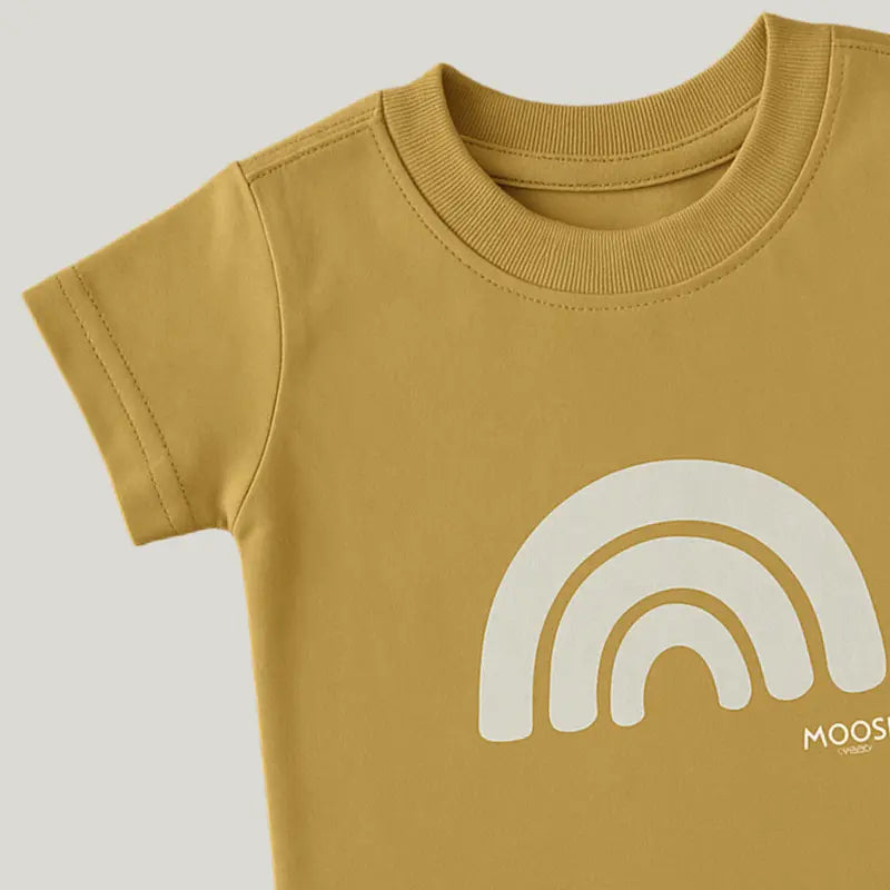 camisa bebê mostarda, camisa bebê com estampa arco-íris, roupa leve e confortável bebê, camisa de algodão infantil, look bebê moderno e delicado