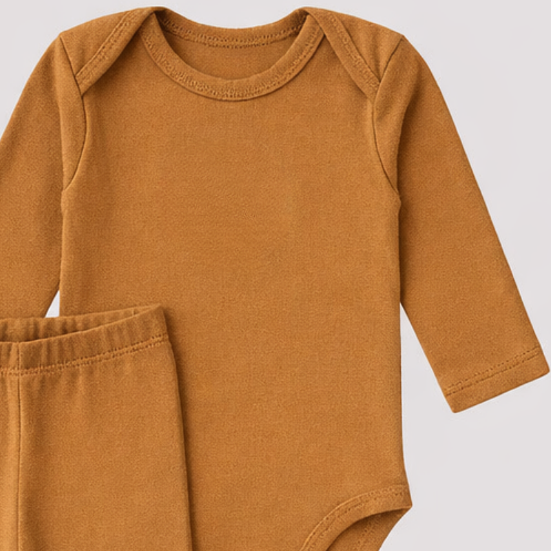 conjunto bebê algodão longo, conjunto bebê caramelo, body manga longa bebê, roupa bebê confortável, conjunto bebê inverno leve