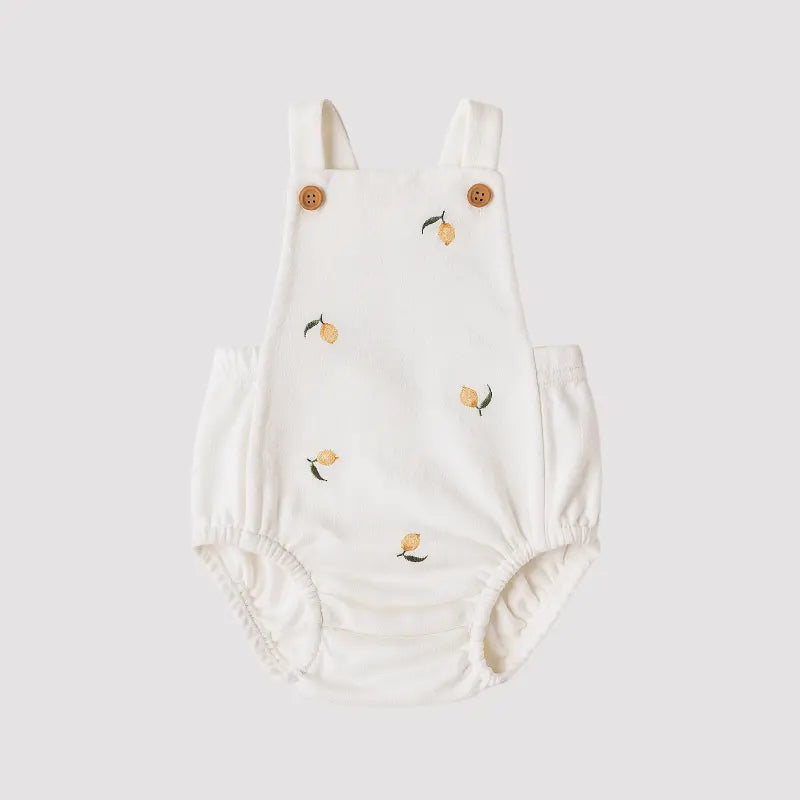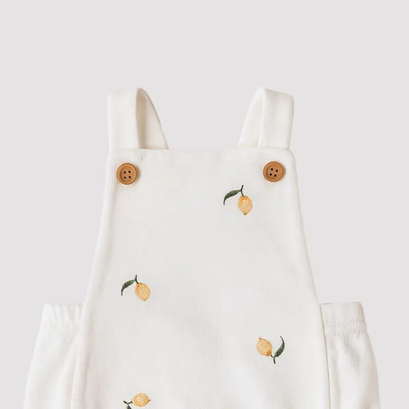 jardineira bebê algodão, jardineira lemon bebê, jardineira branca bebê, jardineira verão bebê, roupa leve bebê, jardineira frutinhas bebê, enxoval moderno bebê