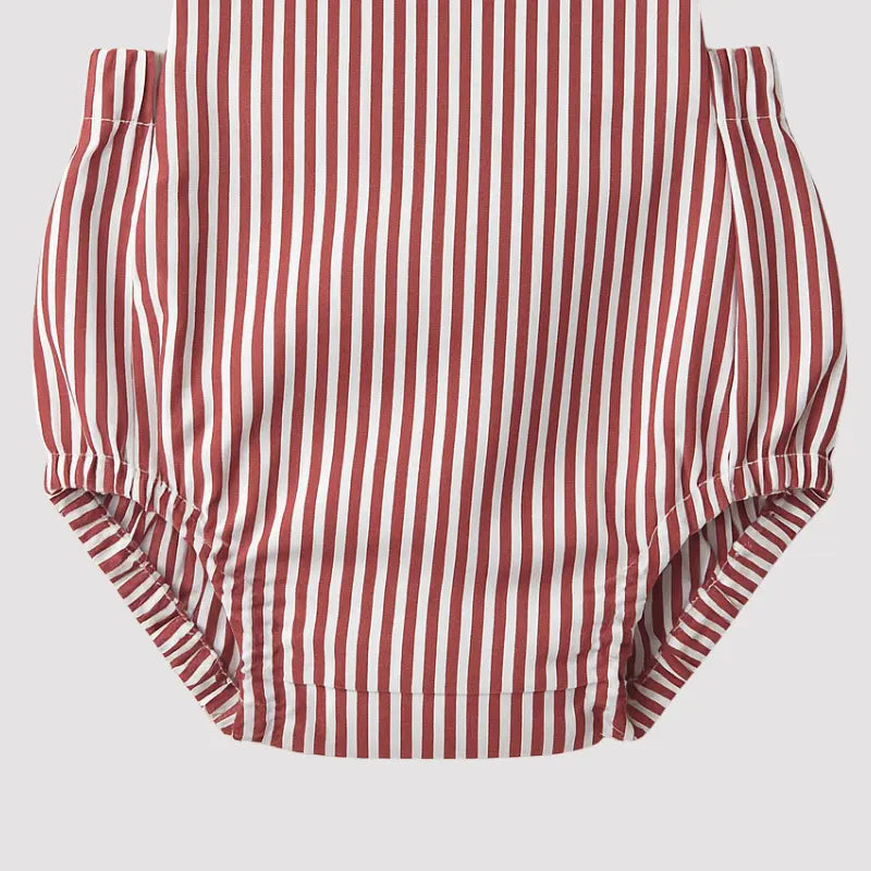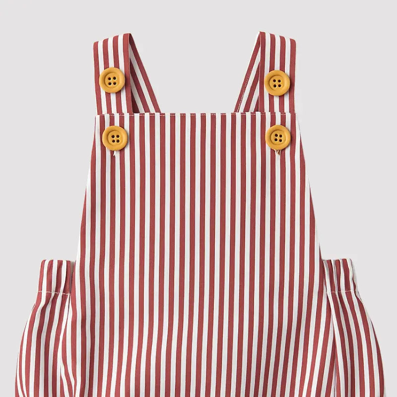 A Jardineira Bebê Algodão Listras Red é confeccionada em tecido em algodão, garantindo conforto, suavidade e liberdade de movimentos para o bebê.