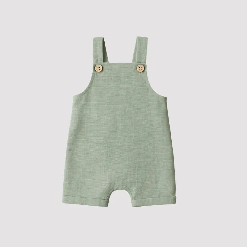 A Jardineira Bebê Leif Linho Verde Curto é confeccionada em tecido de linho misto, leve, respirável e confortável, garantindo liberdade de movimento e frescor para o bebê.