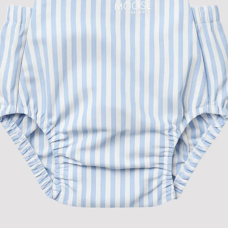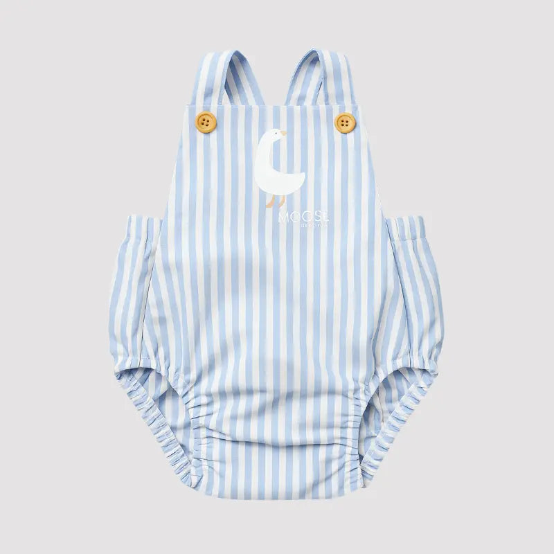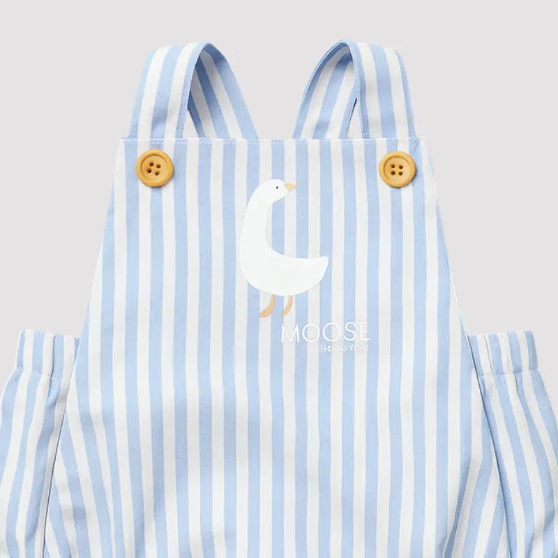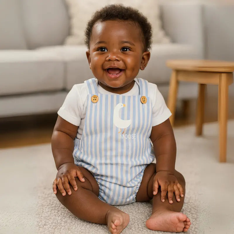 A Jardineira Bebê Patinho Listrada Azul é confeccionada em tecido leve e macio, garantindo conforto e liberdade de movimentos para o bebê.
