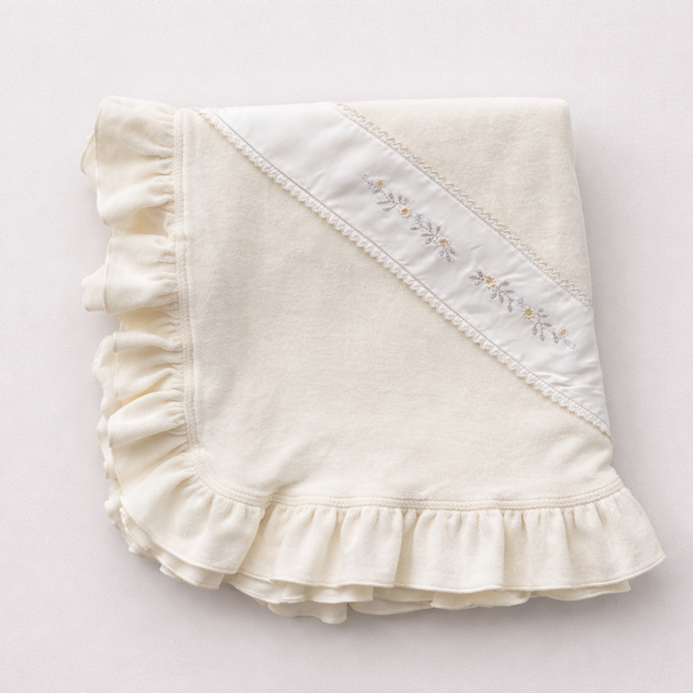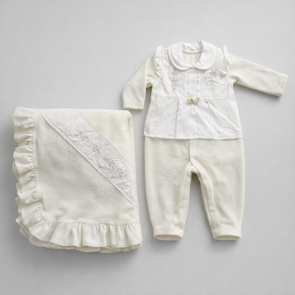 O macacão possui um acabamento refinado com babados sutis e aplicação floral , criando um visual romântico perfeito para a maternidade. Acompanha uma manta combinada , ideal para manter a sua bebê aquecida e confortável nos primeiros dias.