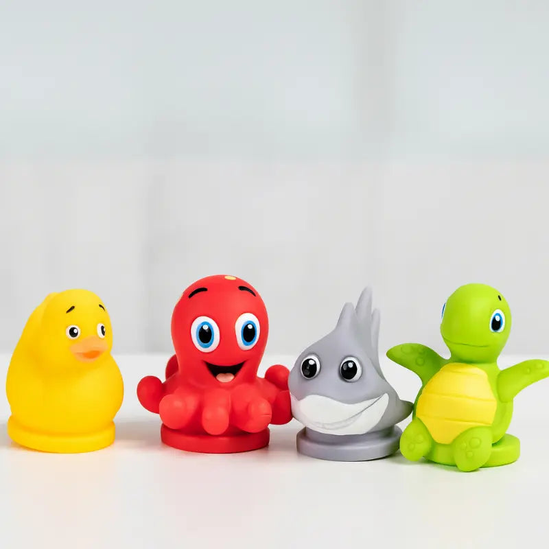 Composto por 4 brinquedos fofinhos de animais marinhos, em material macio e seguro, ajuda no desenvolvimento da coordenação motora e estimula os sentidos do bebê.