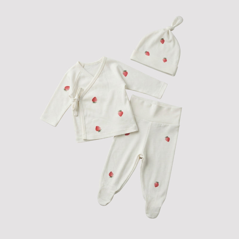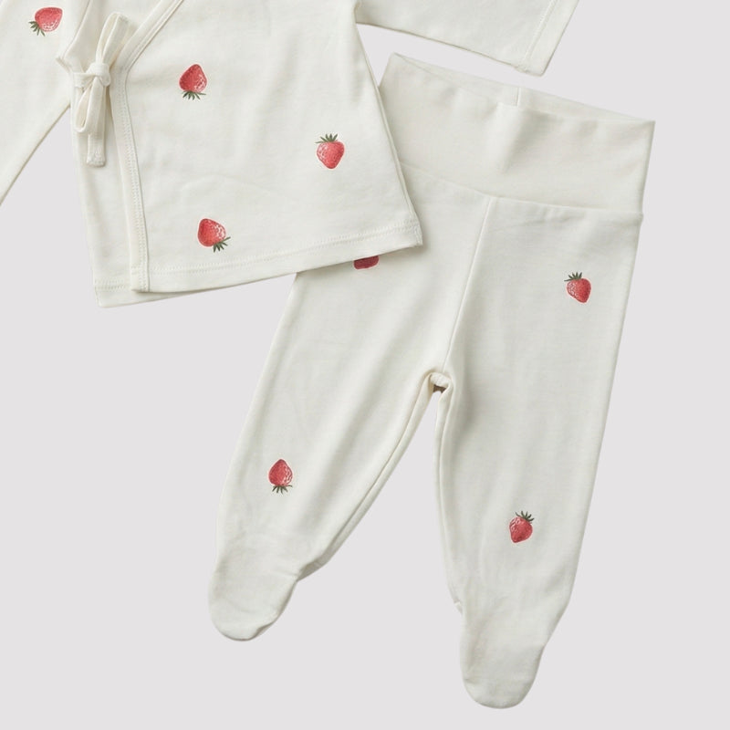 Com estampa delicada de mini moranguinhos sobre fundo claro, o conjunto traz um visual leve, alegre e extremamente encantador — perfeito para um enxoval cheio de ternura.