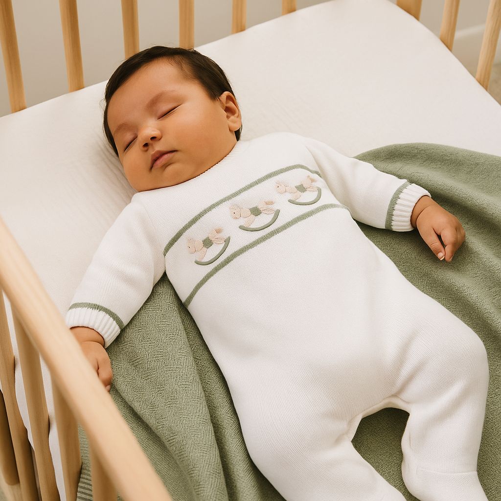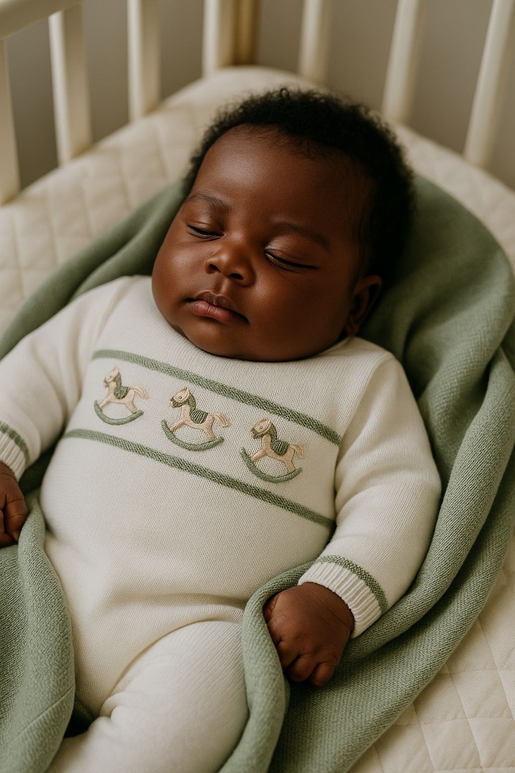 O detalhe delicado de cavalinhos traz um toque lúdico e sofisticado, enquanto o tom green adiciona modernidade e versatilidade ao enxoval.