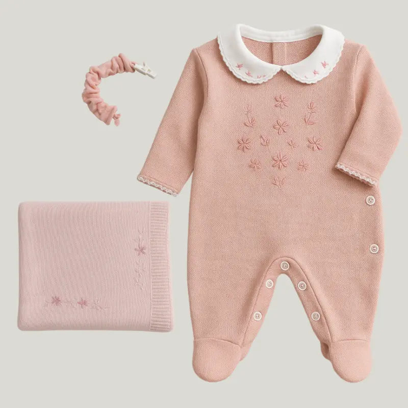 Kit Saída Maternidade Menina Tricot 3 Peças Flora Salmão