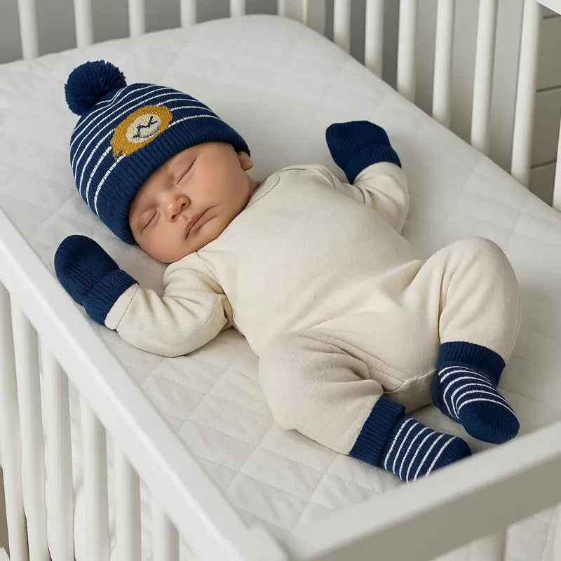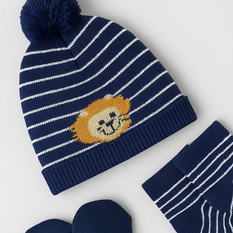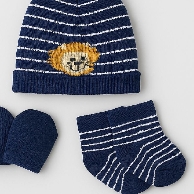 O Kit Touca, Luva e Meia Lion Marinho foi desenvolvido para oferecer cuidado e praticidade nos primeiros dias de vida do bebê.