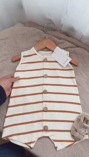 Com estampa de listras em tom caramelo, ele traz um visual delicado, moderno e atemporal — perfeito para o dia a dia do bebê.
