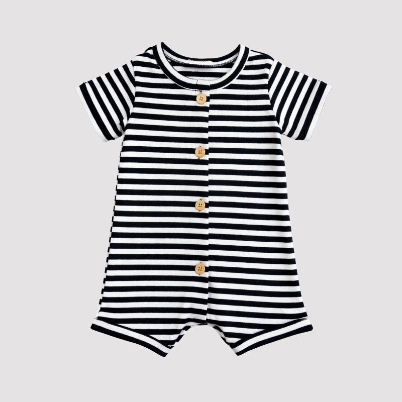 macacão bebê curto, macacão listrado preto bebê, macacão lifestyle bebê, roupa bebê confortável, macacão algodão poliéster bebê, look urbano bebê, enxoval essencial bebê