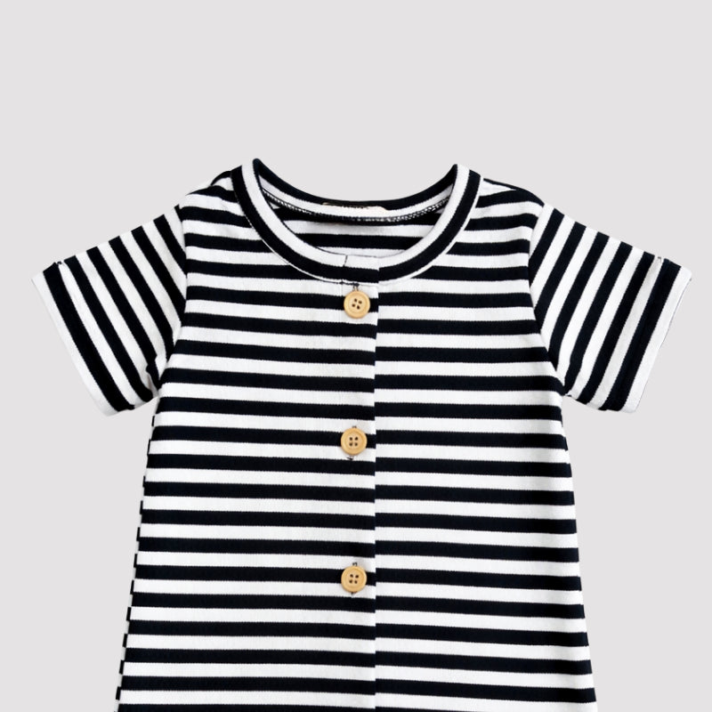 Com listras clássicas em preto e branco, ele traz um visual moderno, urbano e atemporal — perfeito para o dia a dia do bebê.