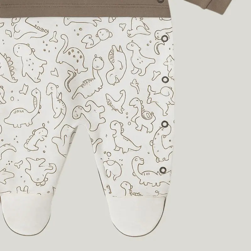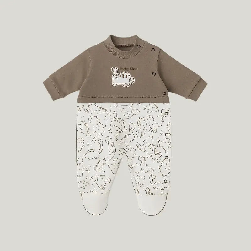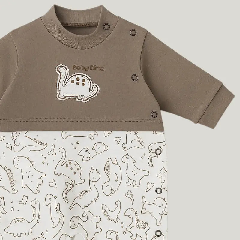 O Macacão Dino Brown Algodão foi desenvolvido em tecido 100% algodão, oferecendo maciez, leveza e respirabilidade para a pele delicada do bebê.