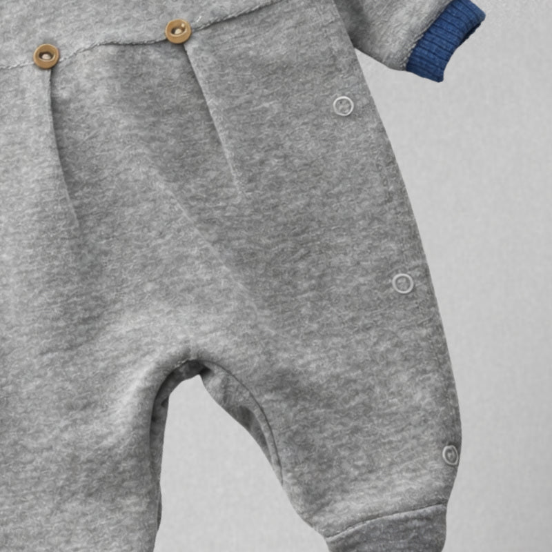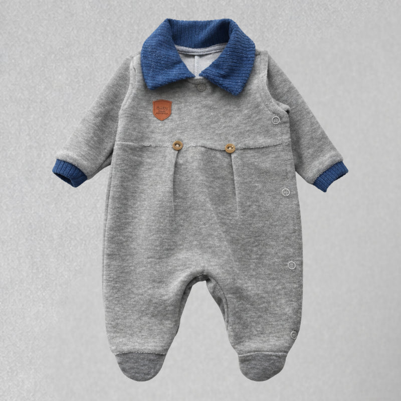 O design clássico com gola contrastante azul traz um toque elegante ao visual do bebê, enquanto os botões de pressão laterais e entrepernas facilitam na hora de vestir e trocar, tornando a rotina muito mais prática para os pais.