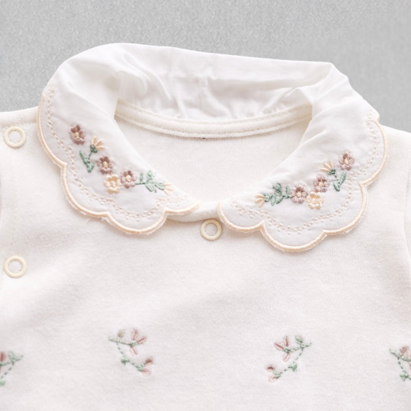 A gola bordada adiciona charme e sofisticação, enquanto o tecido macio garante conforto durante todo o dia. O fechamento com botões de pressão na lateral e entrepernas facilita na hora de vestir e trocar o bebê, trazendo praticidade para a rotina.