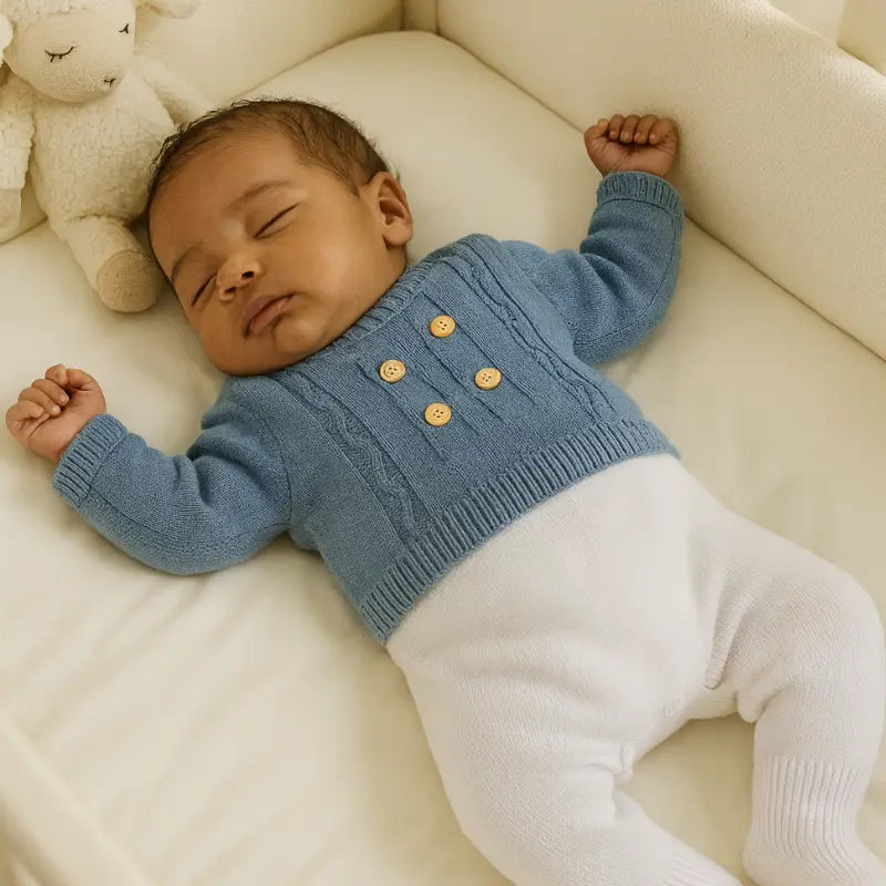 Na cor azul jeans, transmite sofisticação e versatilidade, sendo perfeito para eternizar registros fotográficos da primeira saída da maternidade.