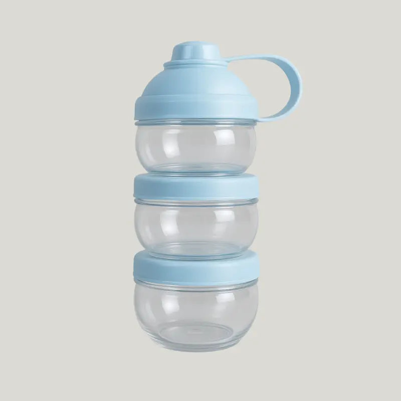 Possui compartimentos separados, permitindo levar porções prontas de leite em pó ou até armazenar snacks, frutas secas ou cereais. A cor azul combina com um enxoval moderno e funcional.