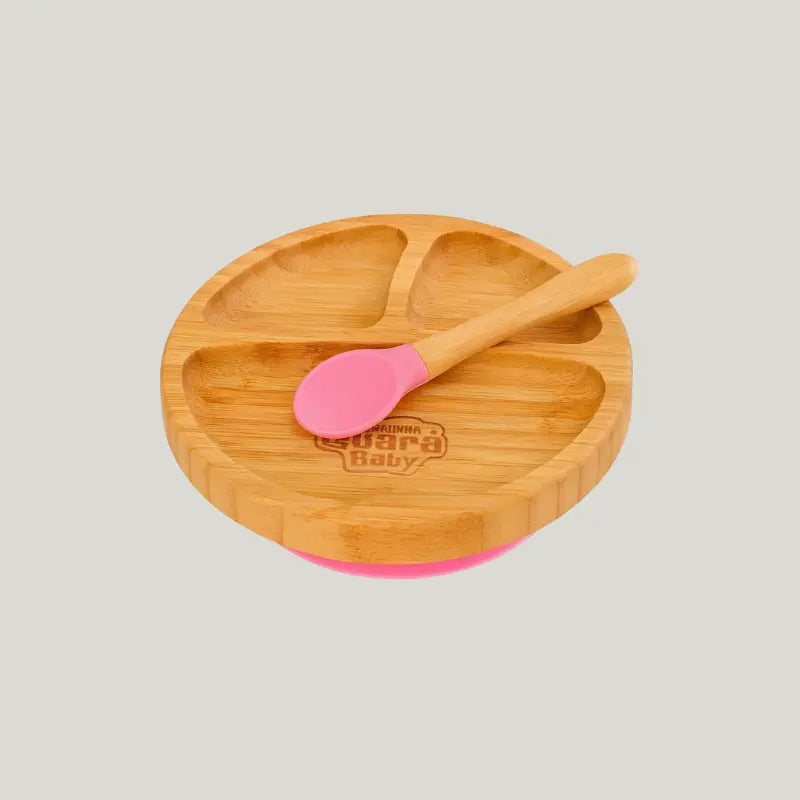 Pratinho Bebê Bambu Com Ventosa E Divisória + Colher De Silicone Introdução Alimentar Rosa